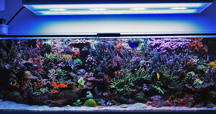 После того как был правильно налажен водооборот через систему фильтрации, следует вплотную заняться освещением. Освещение в морском аквариуме существует не только для того, чтобы разглядывать рыб, беспозвоночных и кораллы, но оно также чрезвычайно важно и для самих аквариумных обитателей. Почти все кораллы нуждаются в интенсивном свете, чтобы фотосинтезировать и производить свои питательные вещества, поэтому при недостаточном освещение или его несоответствии с точки зрения типа или спектра, кораллы погибают. Красивые фиолетовые или розовые кораллиновые водоросли, которые синонимичны здоровой среде морского аквариума, тоже не будут расти без правильно подобранного освещения.