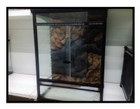Сборно-разборный террариум из силикатного стекла и черного пластика. Прост в сборке. Террариум оснащен раздвижными дверцами и съемной крышкой. Герметичное дно.