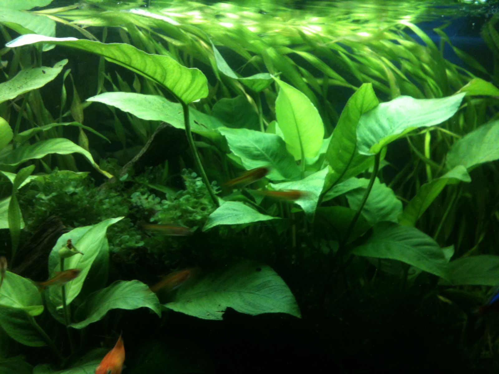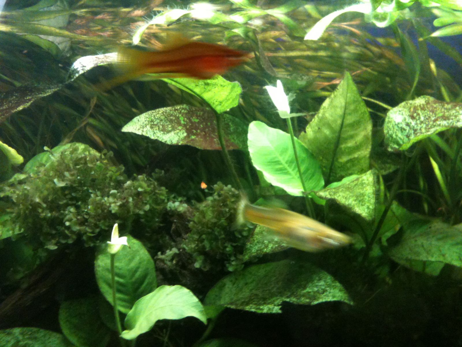 Показатели воды: РН- 7 КН- 3 NO2- 0 NO3- 0,3-0,5 Растения: эхинодорусы, анубиасы, валлиснерия, яванский мох, ломариопсис Население: Меченосцы 4 шт., Гуппи 4 шт.,Неоны 6 шт.,Тетры 6 шт., Фантомы 6 шт. Креветки амано 10 шт. |